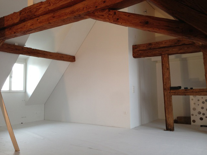 Dachstock wurde zu Wohnraum umgestaltet, neue Wände und Böden (Eichenparkett). Decken in Fichten Massiv-Holzplatten weiss gestrichen.
