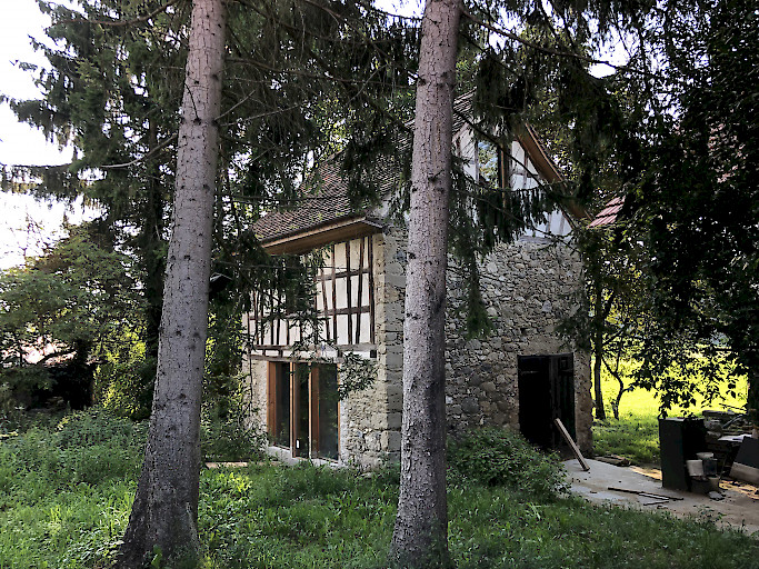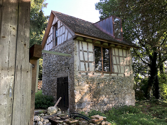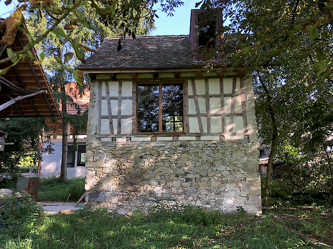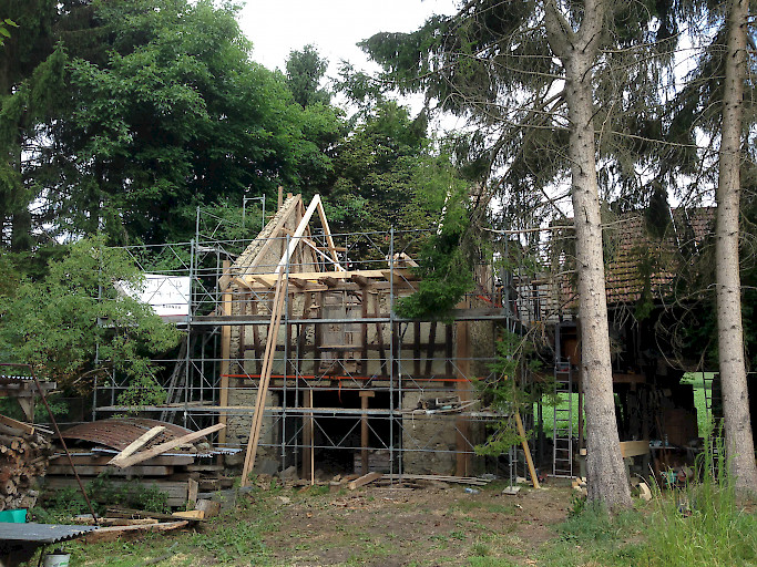 Die Dachkonstruktion wurde komplett erneuert, teilweise mussten auch die Bodenbalken ausgewechselt werden. Mit dem Weichfaserunterdach und der Dämmung zwischen den Sparren, konnte einen angenehmer Wohnraum geschaffen werden. Die handgefertigten Biberschwanz-Ziegel konnten wiederverwendet werden.