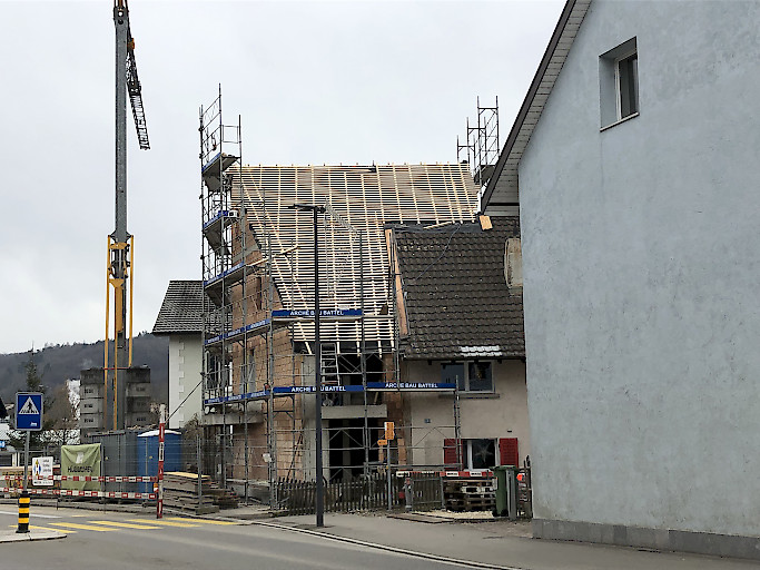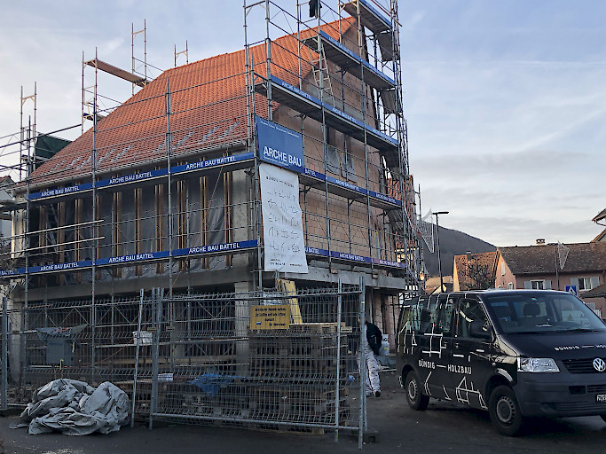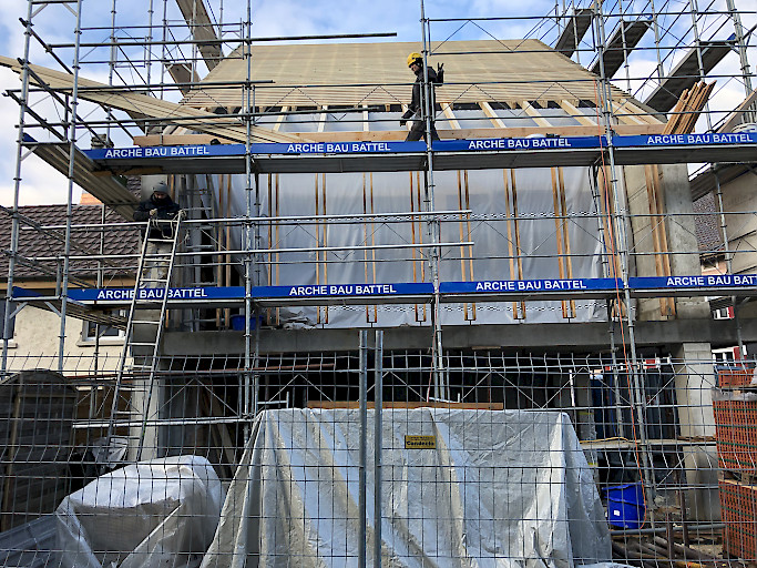 Holzelemente zusammengebaut und aufgerichtet, Biberschwanz-Ziegel Doppeldeckung verlegt.