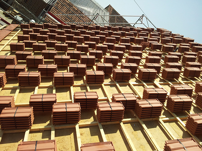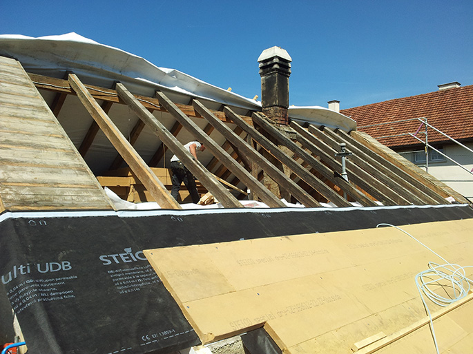 Alte Dachziegel und Lattungen wurden entsorgt, eine Isolierung zwischen den Sparren eingebaut und mit einem Unterdachsystem auf den heutigen Standart saniert.